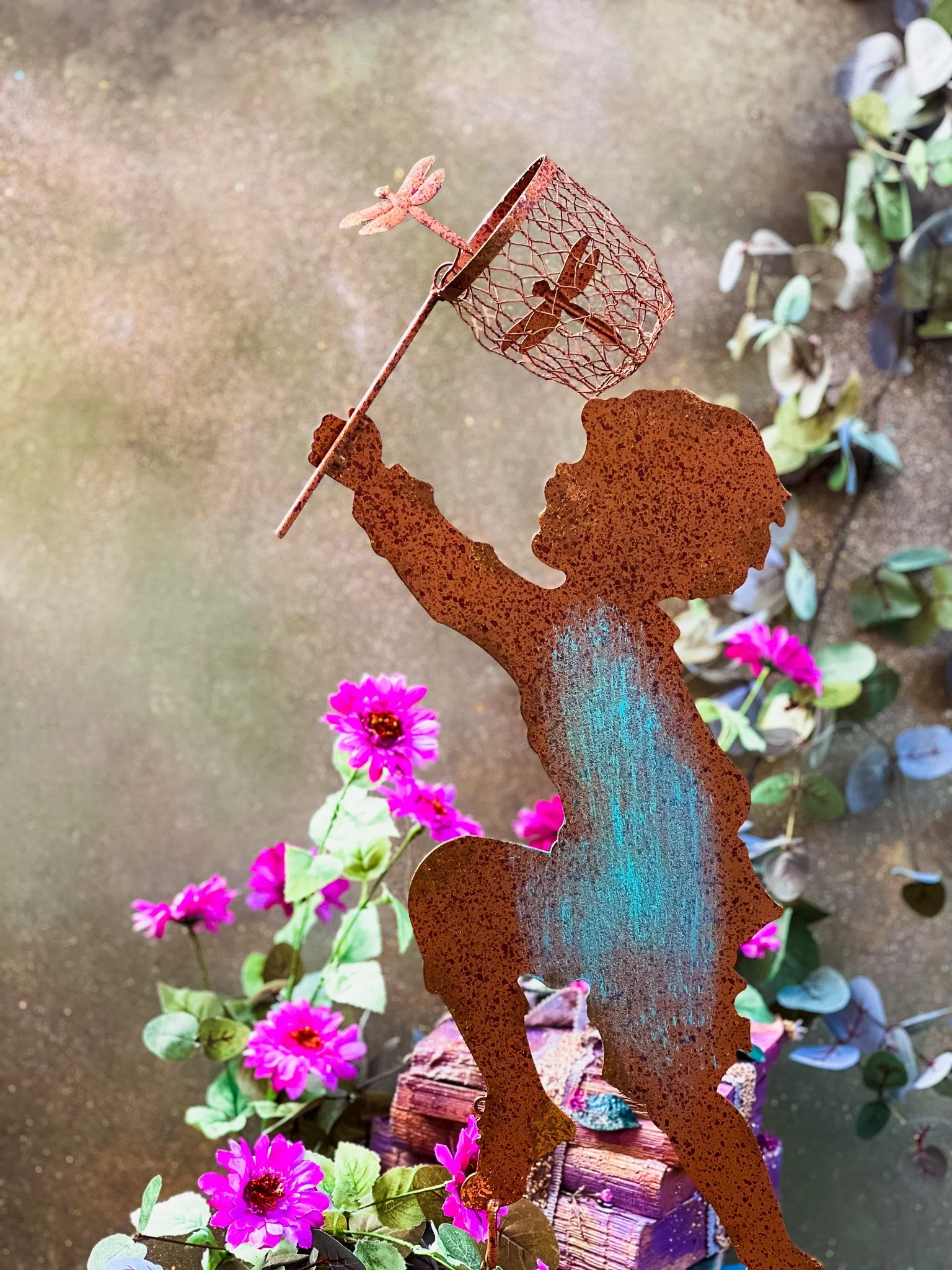 He measures 66cm x 27cm and comes to you in a rusted metal. Free standing, so he can be placed wherever she’s needed!